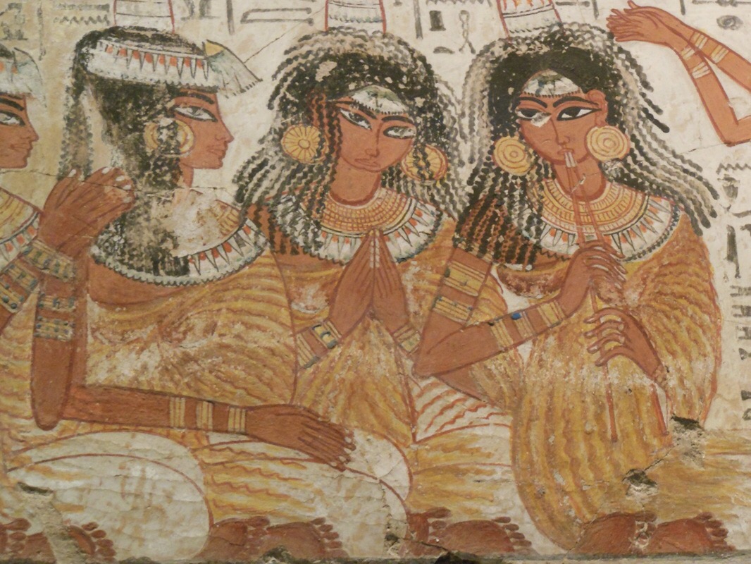 The two figures on the right are said to be the only two existing Egyptian figures that were painted from a frontal perspective. All of the others, like the woman on the left, are painted from a side perspective | via: http://shelbyhughes.weebly.com/ancient-egypt.html